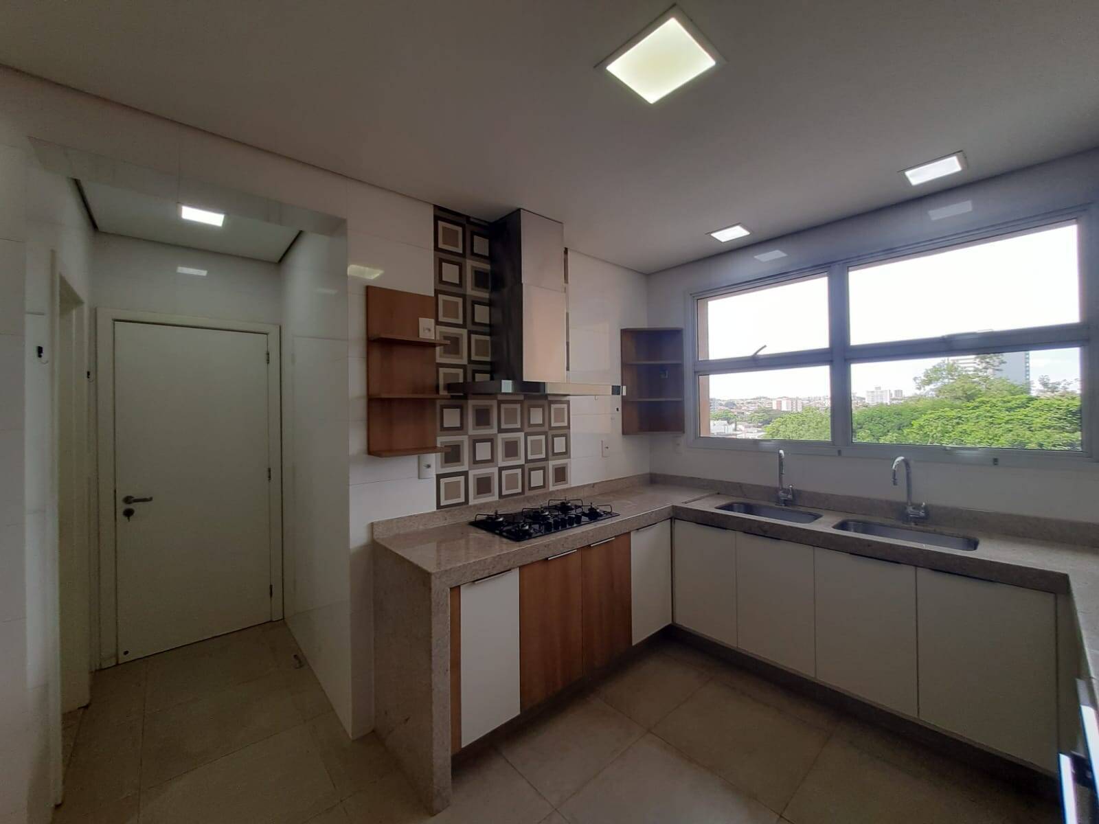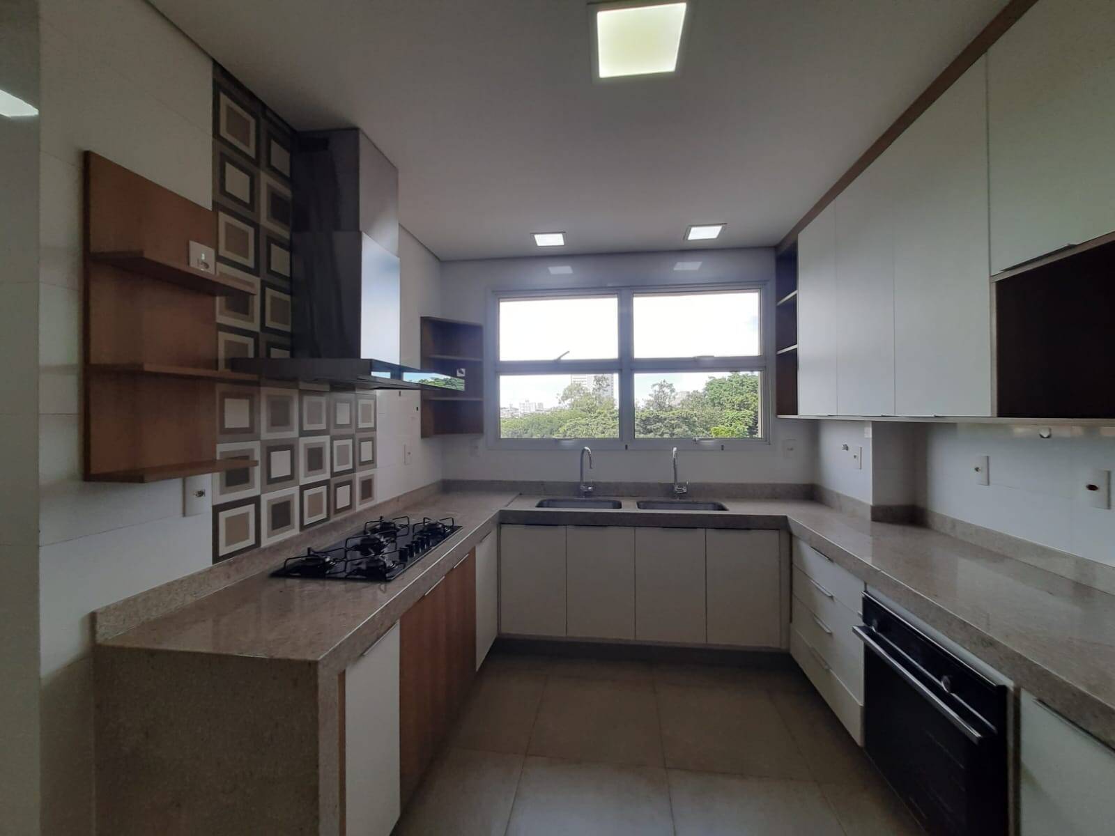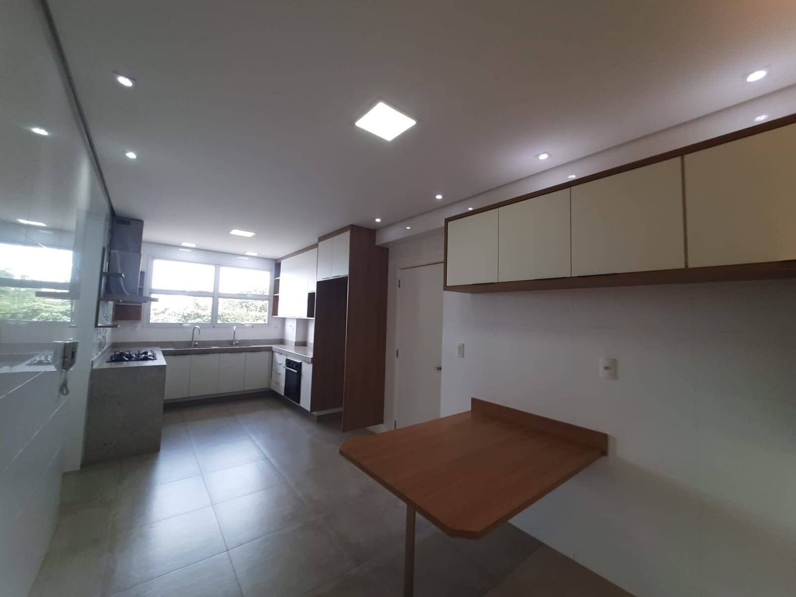 Sala três com 03 ambientes, sala de estar, sala de TV e sala de jantar; ampla sacada com armários e pia; cozinha planejada com cooktop, coifa, forno elétrico, pia dupla e mesa.